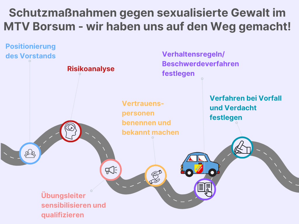 Das Bild zeigt den Weg des MTV Borsum zur Entwicklung und Umsetzung eines Schutzkonzepts gegen sexualisierte Gewalt. Es verdeutlicht, dass dies ein kontinuierlicher Prozess ist, der mit einer klaren Haltung beginnt, über Qualifizierung und feste Regeln verläuft und schließlich in dauerhaft verankerten Schutzmaßnahmen mündet. Dabei zeigt das Auto, an welcher Stelle im Prozess wir uns gerade befinden.