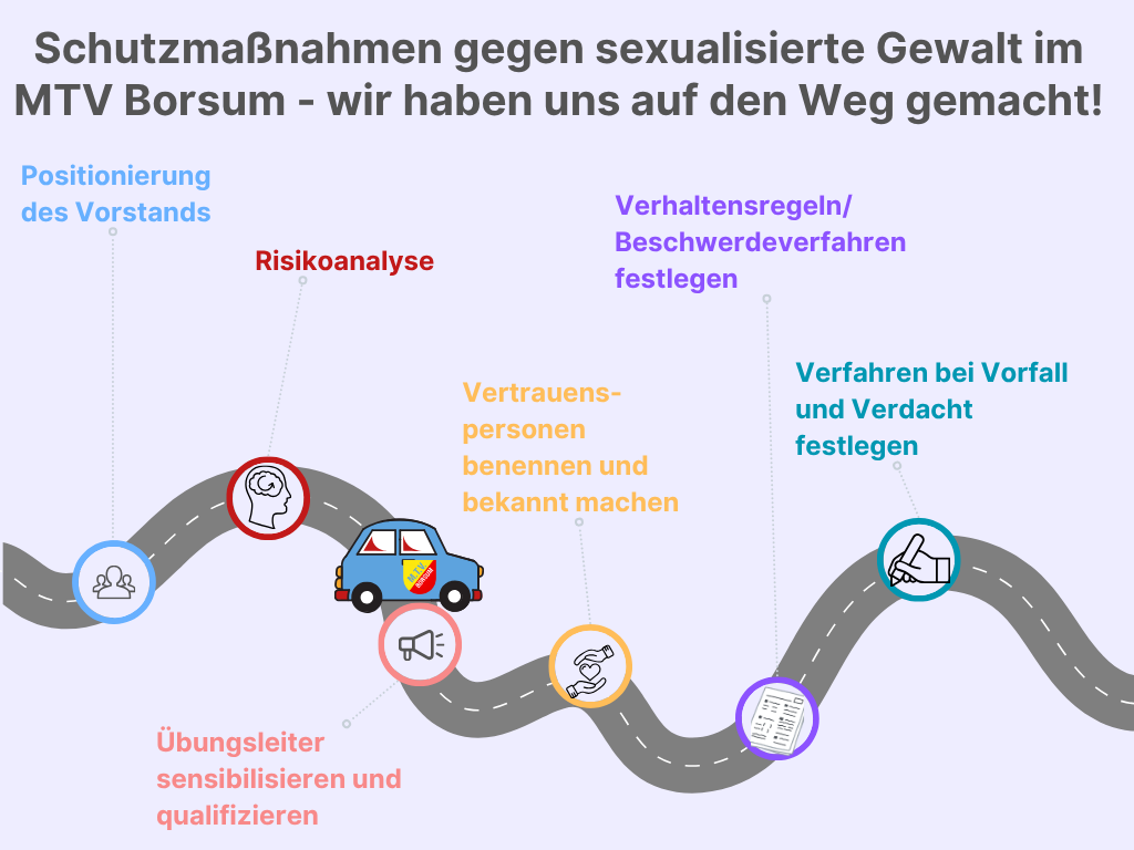 Das Bild zeigt den Weg des MTV Borsum zur Entwicklung und Umsetzung eines Schutzkonzepts gegen sexualisierte Gewalt. Es verdeutlicht, dass dies ein kontinuierlicher Prozess ist, der mit einer klaren Haltung beginnt, über Qualifizierung und feste Regeln verläuft und schließlich in dauerhaft verankerten Schutzmaßnahmen mündet. Dabei zeigt das Auto, an welcher Stelle im Prozess wir uns gerade befinden.